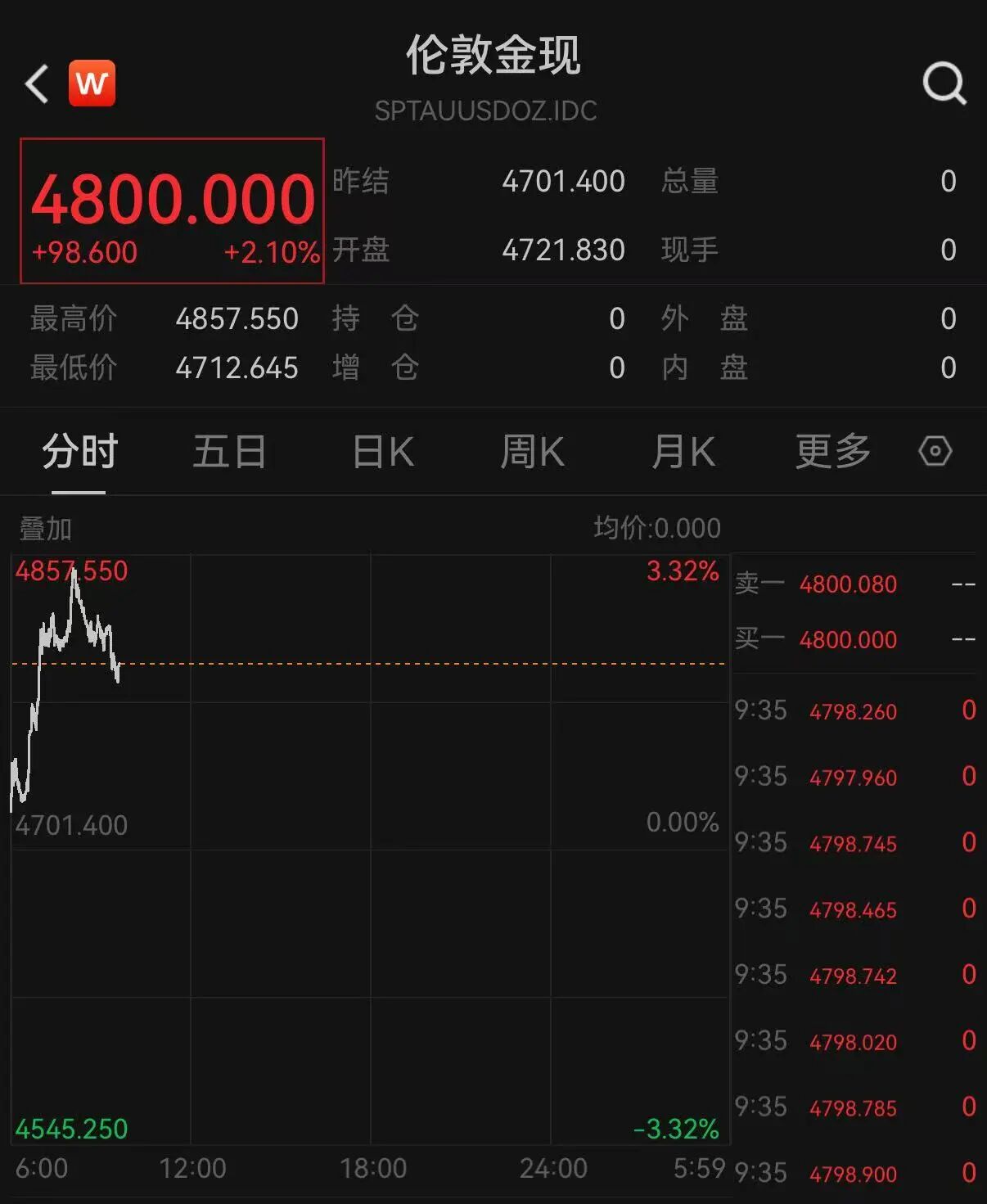 北京功夫4月8日早盘,现货黄金延续上扬,盘中冲破4800美圆,最下报4857.550美圆/盎司,涨超3%。停止收稿有所归降,报4800.000美圆/盎司,涨2.1%。
