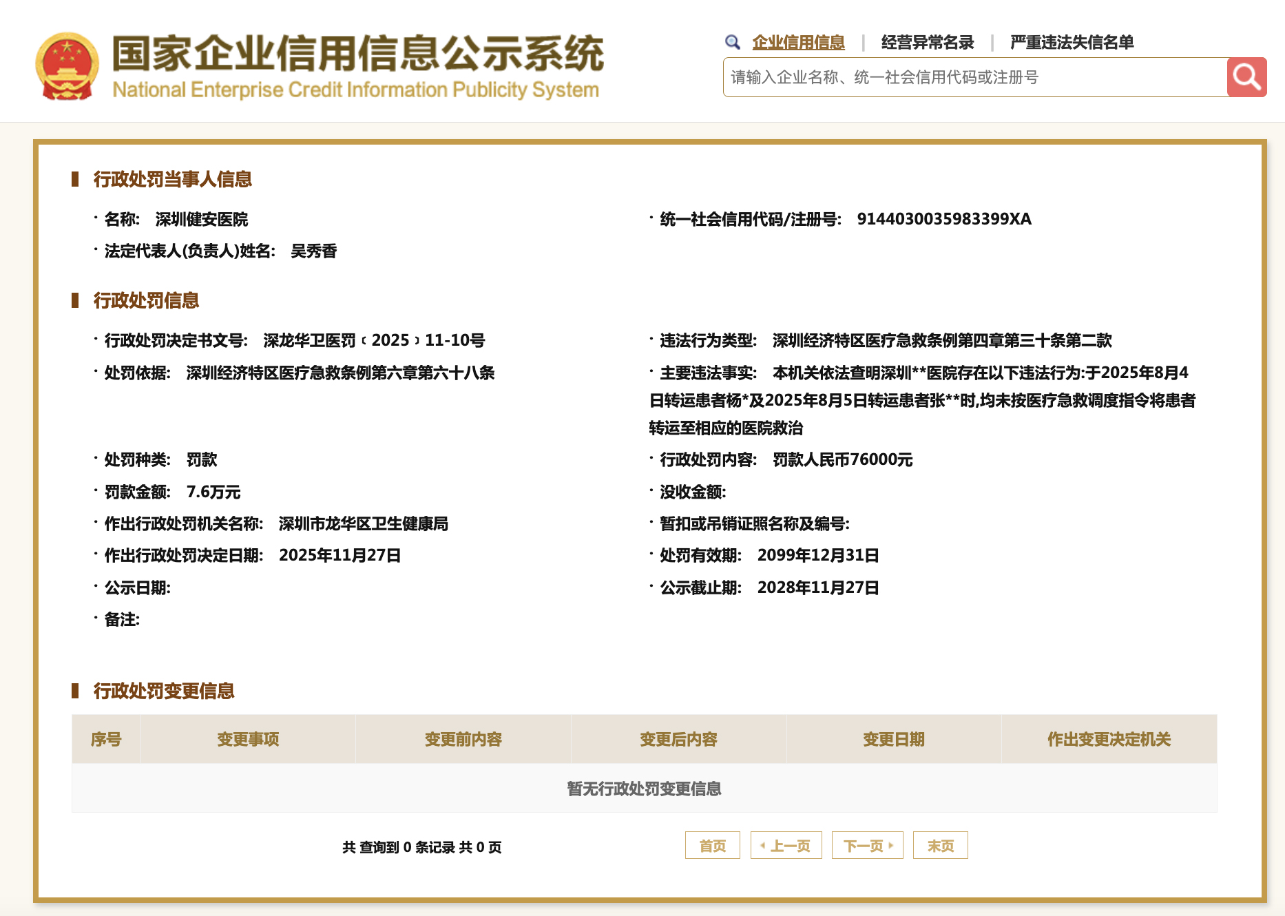 图自邦家企业疑用疑息公示体系 邦家企业疑用疑息公示体系表现,2025年11月,深圳健安病院曾果违背深圳经济特区诊疗援救章程,被深圳市龙华区卫死安康局奖款7.6万元。重要背法究竟,该病院于2025年8月4日转运患者杨某及2025年8月5日转运患者弛某某时,均已按调理挽救调理指令将患者转运至响应的病院救治。(完)